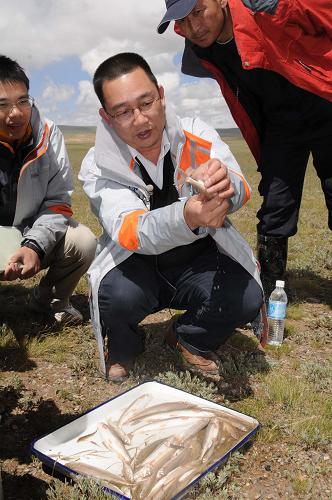 中科院水生生物研究所研究员陈毅峰对刚打捞上来的高原鱼进行讲解(7 月26日摄)。7月底、8月初,由长江渔业资源管理委员会、世界自然基金会(WWF)、青海省农牧厅等组织的“长江源区水生生物资源与环境科学考察”,在青海长江源地区展开。青藏高原水域拥有高原鳅、裂腹鱼等特种鱼类,我国科学界对此已经开展了数十年的深入研究。高原鱼类是我国宝贵的生物基因库,对它们的研究也有助于了解全球气候变化。新华社记者 杨金志 摄