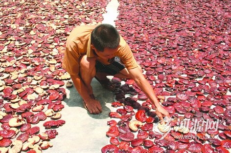 东源县义合镇中洞村顺康农民专业合作社工作人员在晒赤灵芝。据介绍,今年该社获得东源县顺景农民专业合作社扶持种下赤灵芝1万多袋,估计可收灵芝孢子粉50 多公斤、赤灵芝100公斤,产值可达6万多元,扣除投资成本2万元,10户参股社员每户可获分红4000元。据了解,去年以来,义合镇把发展赤灵芝种植作为特色产品来抓,鼓励东源县顺景农民专业合作社以“公司+合作社+基地+院校+农户”的经营模式扶持本镇农民专业合作社发展赤灵芝种植,该合作社在资金、技术、销售(包价收购)等方面提供帮扶,成功带动了500多户农户参与种植赤灵芝,今年户均实现创收6000元以上。