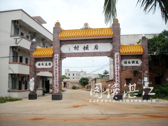 后坛村坐落于广东海洋大学与遐迩闻名的世界地质公园——湖光岩之间,距离湖光镇铺仔圩约2公里,处于得天独厚的地理位置。当车行驶至湖光岩东门对面路口时,余村长停下车让我举目远眺后坛村,并向我简单说明了一些情况。我放眼望去,在一片满目葱翠的土地上,一座座民居楼房拔地而起,一棵棵茂盛的大树掩映着楼房,村边有成片的大叶紫薇、老人葵和龙眼树,还有桉树林、香蕉林和甘蔗林。余村长告诉我,在我们面前的这块空地约有120亩,按本村的建设规划将在这里兴建别墅小区。此时,我伫立遐想,我的眼前仿佛浮现出一栋栋款式新颖的别墅,心中也升起一家人住进别墅的梦想。