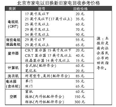 根据国家规定,家电“以旧换新”中的旧家电全部拆解报废,不再进入流通。北京市再生资源和旧货行业协会在广泛调研的基础上,向社会公布了本市旧家电回收参考价格(www.bj3r.com),为市民交售旧家电提供价格参考依据。