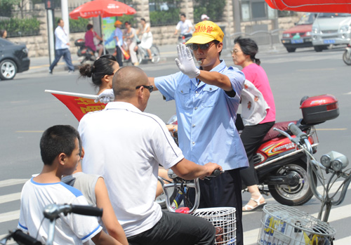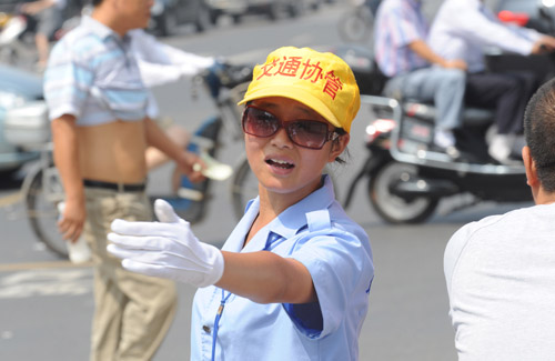 8月11日,大学生交通协管员刘宁在花园路执勤。今年6月,郑州市交警支队招收了10名大学生交通协管员,月工资为650元。“大学生当交通协管员是否屈才”,成了郑州市民热议的话题。大学生交通协管员则认为最重要的是先做好目前的工作,走好迈向社会的第一步。 新华社记者 赵鹏 摄
