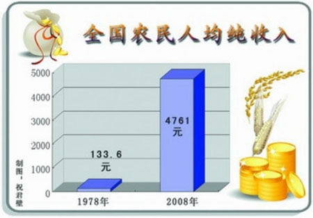 据测算,“四减免”,农民每年得到的好处约1250亿元;“四补贴”,2004年为145亿元,到2009年已增加到1230亿元。亿万农民得到了“真金白银”的实惠。