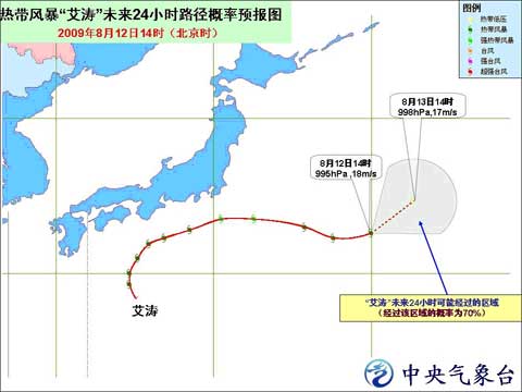 今年第9号热带风暴“艾涛”(ETAU)的中心昨天14时位于日本国东京东南方大约1010公里的西北太平洋洋面上,就是北纬32.6度、东经150.0度,中心附近最大风力仍有8级(18米/秒)。