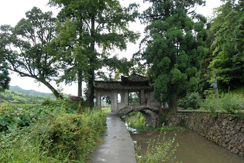 在村口便可见一排苍翠挺拔的巨杉高耸碧空,俨然如哨兵守卫着村庄大门。在桥的左右,分别长着一棵柳杉、香枫,树根起拱,若虬龙探爪,人谓“桥因树成,树为桥生”,两相成趣,颇为奇观。这两棵树左阳右阴,人称“夫妻树”,相互偎依已有五百年的历史。桥下长堤直伸对面山麂,俗称“扁担墩”,也叫“卧龙坡”,迄今已有420年的历史。附近的“冷水湾”中,有口冷水井,泉水水质清醇爽口,冬暖夏凉,含有多种矿物质。此处山水独特,风景浑然天成。