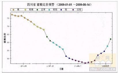 图3 2009年1月~8月第2周四川猪粮比价走势图