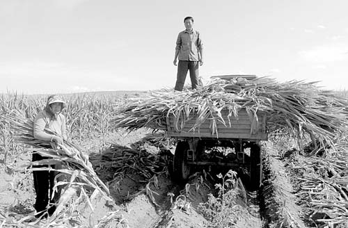 由于旱情严重,吉林省部分地区农作物出现了绝收现象,一些农民割掉玉米,作为青贮饲料出售,以挽回部分损失。卖到奶牛养殖场去的玉米秸秆每斤能卖到5分钱,这样每公顷农田就有1000多元的收入。图为8月18日,吉林省洮南市瓦房镇的农民在装运割掉的受灾玉米。