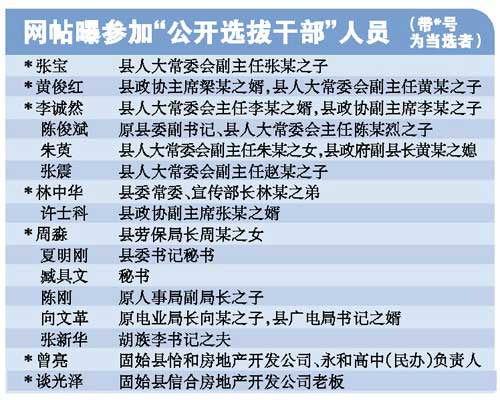 这个流传在各大论坛的热帖《河南固始县公选乡长黑幕:多半官员子弟》称,河南省固始县在 2008年全县选拔正科级干部和县局级干部任用中,所“公开”选拔的乡镇长(正科级)干部中,全是干部子女和县里两大房地产老板的亲戚。帖子还详细公布部分候选人的家庭背景,其中涉及县人大常委会副主任、县政协主席等当地官员。在最后公选出来的12人中,被证实基本都是官员之后,而且有三人是80后。帖子称:难以了解这些当选的乡镇长是否真德才兼备,但如此集中地任用当地“官员”亲属,未免让人感觉“官”也在继承。