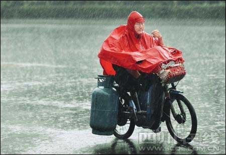 四川局地降暴雨,行人在积水的道路上冒雨骑车。(图片来源:四川在线)资料图片