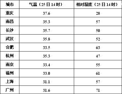 老牌“火炉”重庆依然表现不俗,以迅猛无比的势头将气温升至39.9℃,创今年8月以来气温最高值,仅次于7月19日的40.4℃,成为今年的第二高温。武汉继续书写着成为历史同期最为凶猛的“秋老虎”的记录,以34个高温日与长沙一起成为自今夏以来的第全国最热的省会。25日达到高温标准的大城市还有杭州、南昌、南宁。