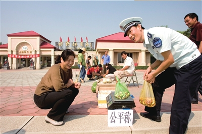 为方便农民出售自产土特产,丰台城管部门在丰台区青龙湖公园东门设置免费摊点。昨天,为保障顾客利益,城管队员还免费提供一台公平秤。