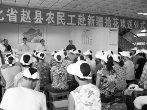 从2005年开始,赵县连续四年组织了六批农村妇女共1000余人赴新疆采棉,最近的一次是2008年9月组织的160人进疆采棉,短短两个月劳务收入50余万元。由于这些嫂子讲诚信、有技术、能吃苦,被新疆用工企业亲切称为“赵州亮嫂采摘队”。目前,140余名“赵州亮嫂”正在内蒙古采摘枸杞,县就业部门正在组织即将赴疆的第七批采摘人员。据统计,“赵州亮嫂采摘队”共挣得劳务收入已超过300万元。赵县妇女乐意参加赴外采摘的一个重要原因,是由于赵县政府采取了补贴单程路费、免费体检、选派专人全程跟踪服务的鼓励政策。