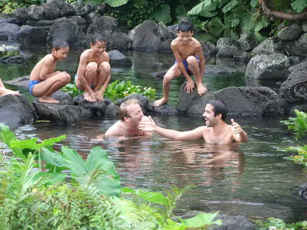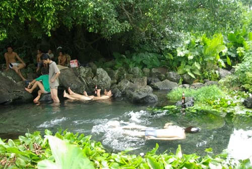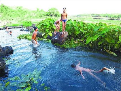 久温塘火山冷泉,泉水潺潺,三五成群小鱼遨游。冷泉周边,植物繁茂,古木参天,数棵大榕树独木成林,百花奇草争艳,四季花果飘香,空气清新无污染。最大冷泉池可以容纳10人泡浴。