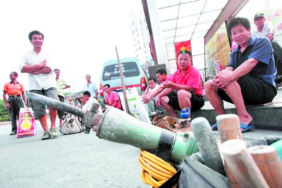 昨日,几名农民工在中山西路上等待用工方挑选。而在一些机械制造行业,却是一“工”难求。贺文兵摄