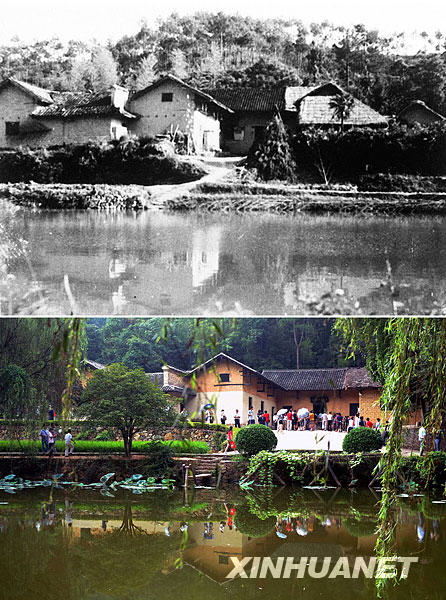 上图为1950年拍摄的韶山冲毛泽东故居(资料照片);下图为2009年9月4日,中外游客在毛泽东故居瞻仰参观