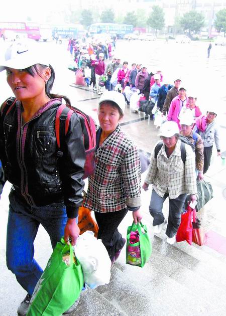 为最大限度地方便农民工,漯河火车站数十名职工组成了志愿者服务队,为每人发放“专列乘车须知”,并准备了茶水和防暑降温药品等。火车站客运车间书记万柱告诉记者,为保证赴疆务工团队顺利购票,该站专门派出送票人员,抵达输出地交到组织者手中。