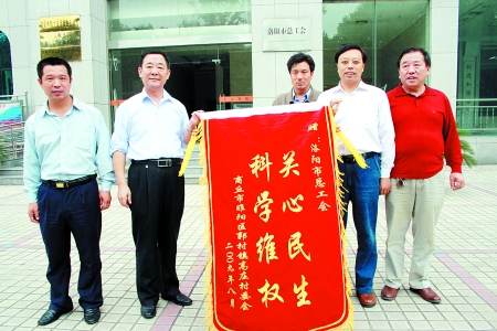高代玉的家属和村委会负责人向洛阳市总工会赠送锦旗。