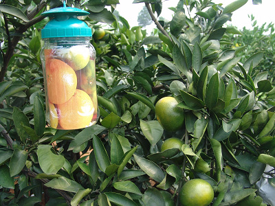 广西壮族自治区桂林市雁山区雁山镇良丰柑桔示范基地,采用害虫性诱剂扑杀器,主要诱杀桔小实蝇、柑桔潜叶蛾等柑桔主要害虫,果实美观漂亮。