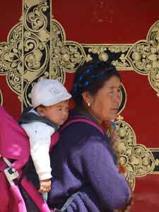 格桑家的女主人背着小外孙站在自家装饰一新的大门前。