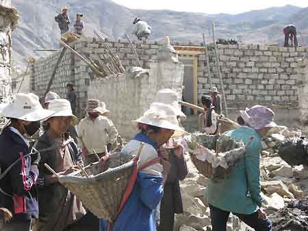 离开格桑家,我们在村庄中发现了一处“工地”。一群男女正在热火朝天地忙活着:妇女们背材料;男人们在上梁;老阿妈背着水桶来送水;只有孩子们在一旁快乐地玩耍。一打听,才知道这是村民们在盖新房。在这里,一家盖房,全村人都会来帮忙,几天就能完工。