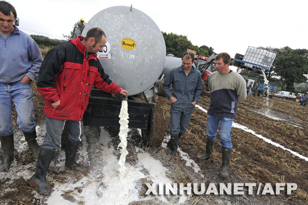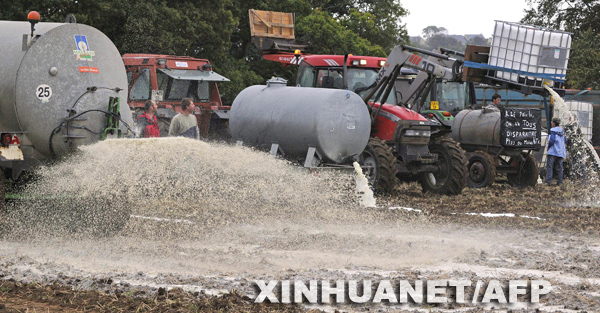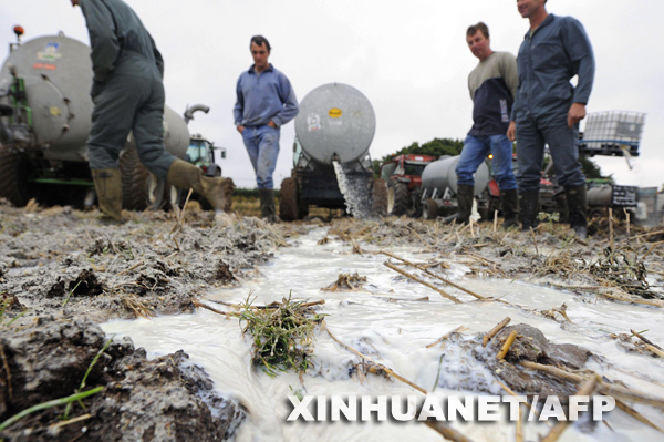9月16日,在法国北部的莱皮约,奶农将约7万升牛奶倾倒在田地中以示抗议。