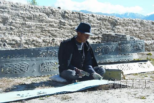 索朗旺堆在为群众制作新房上的屋檐花边。
