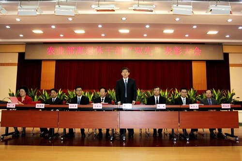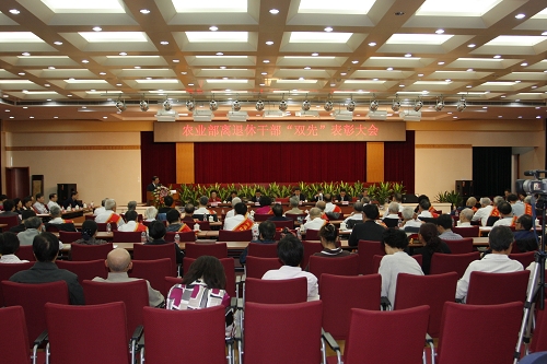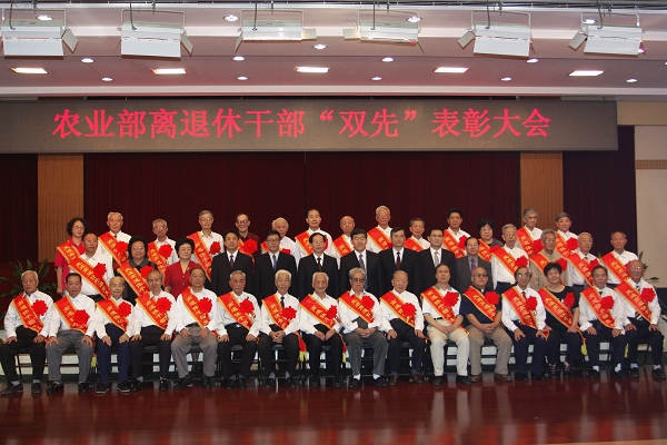 表彰大会由农业部党组成员、副部长牛盾主持。部党组成员梁田庚宣读了农业部表彰先进离退休干部党支部和离退休干部先进个人的通报。危朝安、牛盾和中组部老干部局副巡视员赵庆、中央国家机关工委老龄办副主任魏黎耕等领导向受表彰的离退休干部党支部和先进个人颁奖,并与大家合影留念。受表彰的离退休干部党支部和先进个人代表作了典型发言,办公厅、部直属机关党委、部直属事业单位的负责同志,部机关和部直属单位离退休干部工作部门的同志、离退休干部党组织负责人和离退休干部代表,受表彰的先进离退休干部党支部和离退休干部先进个人共200多人参加了大会。