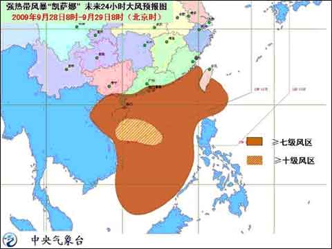 受“凯萨娜”及其外围云系的影响,28日白天到夜间,南海大部海面、海南东部和南部沿海将有7~9级大风,“凯萨娜”中心经过的附近海面和地区的风力将有10~12级大风,阵风可达13~15级;巴士海峡、巴林塘海峡、台湾海峡、琼州海峡、北部湾、台湾以东海面、广东沿海、福建中南部沿海、广西沿海也将有6~7级大风,阵风可达8~9级;浙江南部沿海、福建北部沿海及东南部沿海、台湾东部、广东沿海大部、海南大部等地有大雨,广东中部沿海及海南中东大部地区有暴雨,海南东部的局部地区有大暴雨。