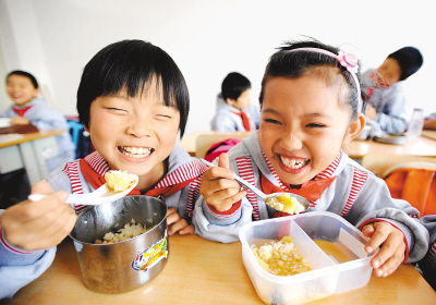 10月10日,辽宁省沈阳市砂山四校的特困农民工子弟正在吃免费午餐。沈阳市在砂山四校等6所农民工子女集中的小学启动了“爱心午餐”行动。按照每人每年1000元的标准,依据特困生实行全部免费,边缘贫困生享受部分免费的原则为农民工困难家庭子女提供免费午餐,受益学生达3248人。