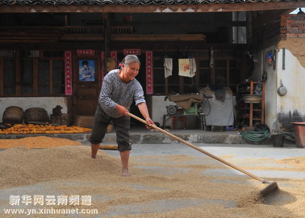 村民杨祖芹在晾晒秋粮 位于云岭高原深处的云南省保山市昌宁县田园镇三甲村,是一个典型的山区贫困村。2008年,该村开始启动一系列攻坚脱贫项目,采取农户自筹、政府投入、社会捐资、整合扶贫资金等方式,投入1200多万元,改造村容村貌,兴修水利、改善交通、打造桑田并兴建文化教育设施。目前,已经完成灌溉、道路、灯光、饮水、桑田、蚕房、文化设施和庭院建设等工程项目,村容村貌大幅改观,农民生活环境及生活质量明显提高。