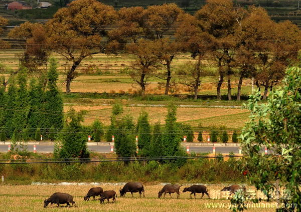 几头水牛在三甲村田间觅食 位于云岭高原深处的云南省保山市昌宁县田园镇三甲村,是一个典型的山区贫困村。2008年,该村开始启动一系列攻坚脱贫项目,采取农户自筹、政府投入、社会捐资、整合扶贫资金等方式,投入1200多万元,改造村容村貌,兴修水利、改善交通、打造桑田并兴建文化教育设施。目前,已经完成灌溉、道路、灯光、饮水、桑田、蚕房、文化设施和庭院建设等工程项目,村容村貌大幅改观,农民生活环境及生活质量明显提高。