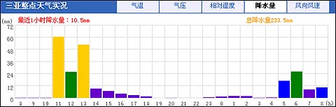 21日08时至22日08时,三亚24小时降水量为233.85毫米,其中21日11时-16时6小时内降雨量高达160毫米,为特大暴雨级别。