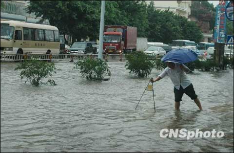 21日下午3时许,骤雨初歇,在三亚大东海,一段近两百米的主干道完全被雨水淹没,过往车辆排起了长龙,小心翼翼地在水中前行,有警察在没过小腿的积水中指挥交通。一辆中巴车在水中不幸熄火,而一辆拖车正在拖走在水中抛锚的小汽车。过往的许多市民和游客也不得不卷起裤脚在水中摸索前行。“我从上午 11点50分左右到红沙路段,直到下午3点左右才过了大东海,阻了3个多小时。”开车从亚龙湾前往市区的聂先生告诉记者,离大东海不远处的红沙路段也同样是积水严重。