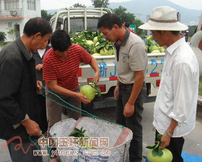 在垟根村的村道上,我们碰到了几个正在交易的果农,评个头、看色泽、讲价格,虽是小额交易,但买卖双方都毫不含糊;而另一边,几个民工正把装好的文旦,一袋一袋的装车,准备发往外地。该村党支部副书记汪光夫告诉我们说:“现在我们的文旦是供不应求,每天都要包装好分几车运到全国各地,最主要的是销往杭州等大中城市。”