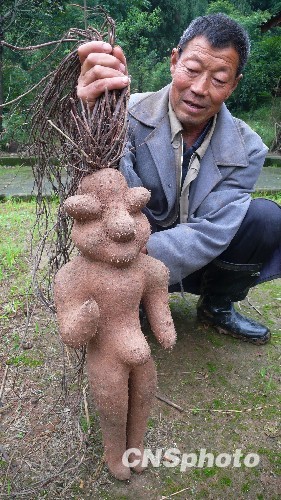 10月27日上午,四川阆中市江南镇大田坝村63岁的老农郑德训向记者展示了他5天前挖出的一株酷似人形的何首乌。