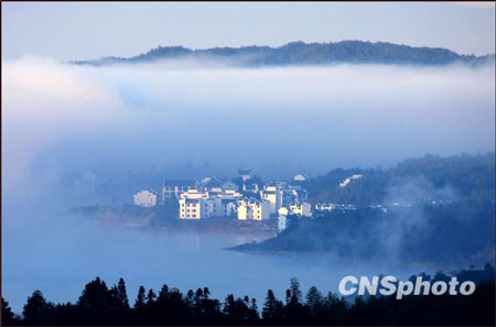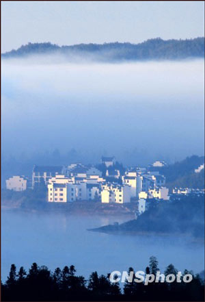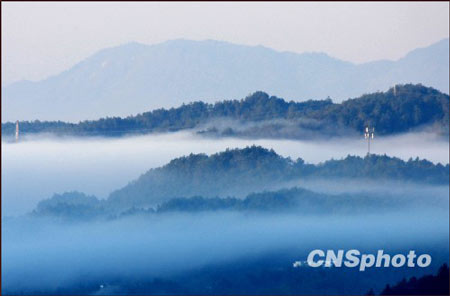 2009年11月4日,皖南黄山脚下的塔川出现罕见的“流云”奇观,从塔川东边山坳中涌现一股“流云”向西飘移,登高远眺的塔川村落仿佛在云海中浮游,“流云”将村落拦腰裹住,唯有山峰清晰可见。