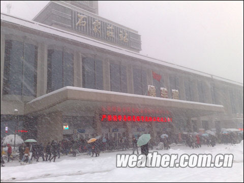 此后北边降雪减弱,南部小雨变成暴雪。截至到10日14时,河北中南部普降大到暴雪,石家庄市区降水量达到了22毫米,积雪深度达17厘米。
