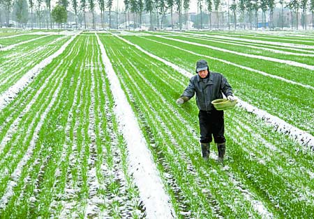11月11日,在博爱县清化镇高庄村,一位村民冒雪为小麦追施越冬肥 程 全 摄