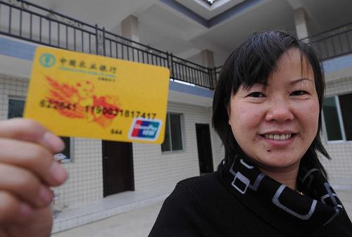 11 月18日,在贵州省贵阳市南明区永乐乡水塘村,农民文燕展示农行为她办理的惠农卡。文燕家通过办理惠农卡,于2009年7月获得当地农行4万元的低息贷款,装修和扩建住房,办起了农家乐。2009年1月以来,贵州省农行系统在全省范围内的农村推广惠农卡,该卡具有农户联保、低息、便捷、农行职员全程跟踪管理服务等特点,受到农民欢迎。截至11月18日,全省农行已为82.9万多户农民办理了惠农卡,其中为3.6万户农民授信,授信金额达8.6亿元,农民实际使用金额为7亿多元,这些资金为农民发展生产、增收致富发挥了重要作用。新华社记者 杨楹 摄