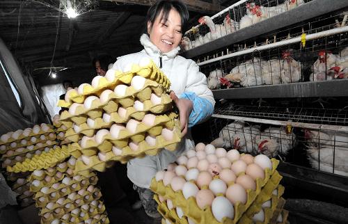 11 月18日,在贵州省贵阳市南明区永乐乡水塘村,农民罗华美在装运鸡蛋。罗华美家通过办理惠农卡,于2009年5月获得当地农行5万元低息贷款,办起了养鸡场。养鸡场的3500只鸡中,有2700多只从7月底开始产蛋,罗华美家现在每天可收入近700元。新华社记者 杨楹 摄
