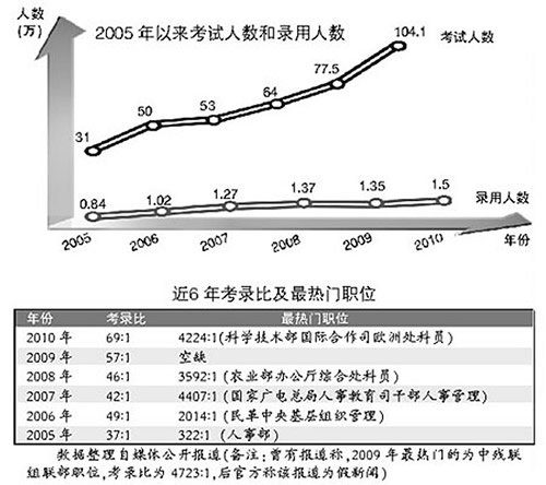 从2007年的53万考生到2008年的64万考生,再到2009年的77.5万名考生,公务员考试的报考人数逐年递增。尽管此次招考规模比去年增加了10%左右,但录取率也大约只有1.44%,比上年的1.75%又低了一些。也就是说,淘汰率超过了98.5%。