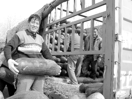 记者看到,一些津、京、晋、陕等字号开头的大货车在郸城县城至冬风乡的乡间道路上排成了长龙,一架超大的地磅、一群购销冬瓜的经纪人和农民搬运工忙得没有一丝空闲。虽然刚下过雨雪,农村道路多泥泞,但装满冬瓜的机动三轮车轰鸣着从泥路冲上柏油路,把丰收的果实装上大货车,换成一沓沓的百元钞票。