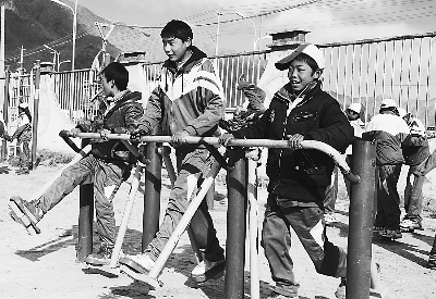 下课了,堆龙德庆县中学的同学们在活动健身。