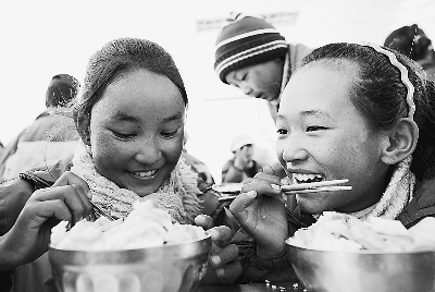 初二年级组组长仁增说,从11月1日起,寄宿生的伙食标准从原来每天5.5元增加到了7.5元,早饭是稀饭、包子和鸡蛋,隔一天是酥油茶和馒头,午饭和晚饭有四五个荤菜,吃米饭,饭菜不限量。学生病了,就在学校医务室诊治,费用全免。10月份,学生们都接种了预防甲流疫苗,每周学校还熬两次预防感冒的汤药。