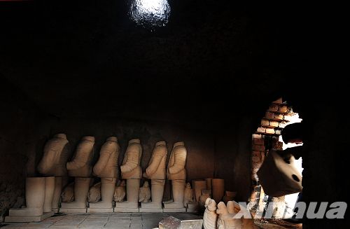 12月24日,一名工人进入窑内摆放仿古工艺品的胚体。
