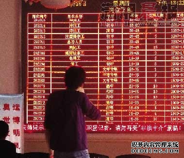 “每天十多个人,太少了。”赵俊感叹。职介所门口,贴着几十条用工信息。记者看到,信息基本上以普工为主,包括宝钢、松下电工、大金空调等企业,月薪2000元左右,还有些企业标明一年发14个月薪水、有上下班车,夜班也有十几元的补助。