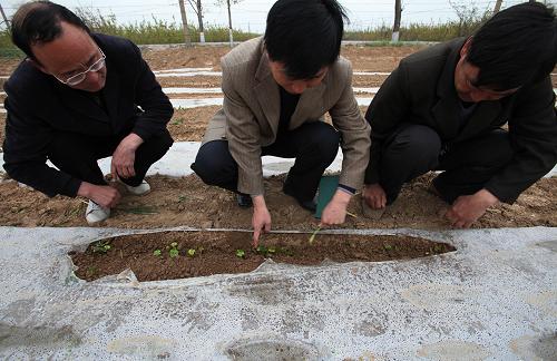 4月13日,3名农科人员在山西省运城市盐湖区龙居镇一棉田查看棉苗冻害情况。近期的低温阴雨天气给各地农业生产造成不利影响,农业部门和农民立即行动起来,全力以赴防灾减灾。新华社发(卫行智 摄)