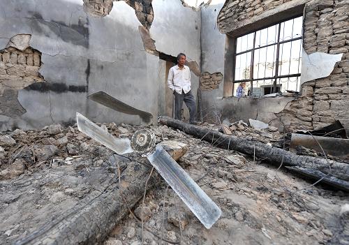 恰特卡勒乡一栋民宅因大风引发的火灾而烧毁(4月24日摄)。4月23日至24日,新疆吐鲁番遭遇大风和沙尘天气。据吐鲁番地委提供的数据,目前42万多亩农田、1.4万多座温室大棚受灾,当地还出现因风灾导致的火灾和建筑物坍塌情况。新华社记者 江文耀 摄