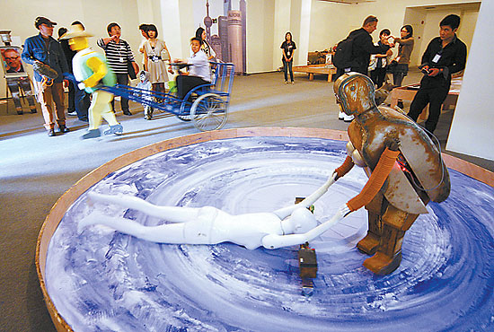 悬在空中的木头飞机、冻在冰里的潜水艇、会泼墨作画的机器人……走进上海外滩美术馆,就像进入了一个荒诞的童话世界,而创作这些“童话”的,是9个农民:吴玉禄、陶相礼、杜文达、王强、曹正书、李玉明、熊天华、徐斌、吴书仔。