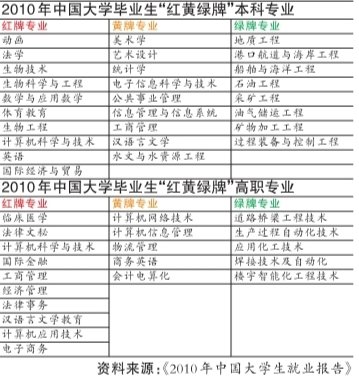 蓝皮书首次披露了2010年大学生“红黄绿牌”本科和高职专业名单。其中,红牌专业是指失业量较大、就业率持续走低,且薪资较低的专业,即高失业风险型专业;黄牌专业指除红牌专业外,失业量较大、就业率持续走低,且薪资较低的其他专业;绿牌专业则指薪资、就业率持续走高,且失业量较低的相关专业,即需求增长型专业。