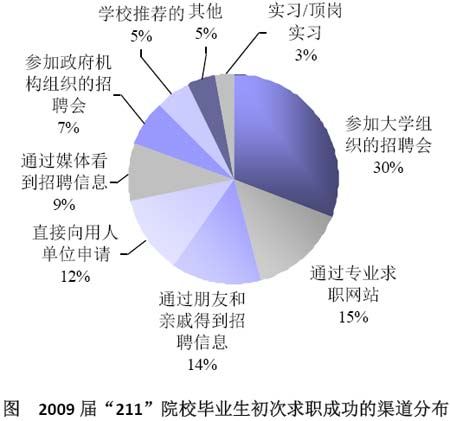 麦可思调查研究显示,2009届大学毕业生的主要求职成功渠道更加多样化,“211”院校是大学招聘会(30%),非“211”本科院校(20%)和高职高专院校(26%)毕业是通过亲朋好友。